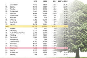 Wien ist Weltklasse. Auch beim Thema "Maßnahmenentwicklung gegen Hitze". 2015 wurde der Urban Heat Island-Strategieplan Wien (UHI STRAT Wien) vorgestellt: ( www.wien.gv.at umweltschutz raum pdf uhi-strategieplan.pdf ) Der Plan ist super (Lesetipp!) - die Umsetzung zum Teil wirklich schlecht. Als eine der vielen sinnvollen Maßnahmen wird die "Erhaltung und Ausweitung des Bestands an (Straßen-)Bäumen" genannt. Wie das umgesetzt wurde, zeigt die Grafik. Der Klimabündnisbezirk Alsergrund liegt da nach 3 Jahren auf Platz 20. - kein Ruhmesblatt. Während der Bestand an Wiener Strassenbäumen im Durchschnitt um 2,4% gewachsen ist, ist am Alsergrund ein Rückgang zu verzeichnen. Ein klares Signal an die Bezirkspolitik, hier schnellstmöglich gegenzusteuern. Die angek&... » Weiterlesen