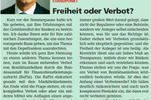 Mein aktueller Standpunkt in Focus Money: Die BaFin reibt sich an Bonitätsanleihen und denkt sehr konkret über ein Produktverbot nach - zu Recht? Was denkt die FB-Gemeinde? Ist das der Anfang einer Verbotswelle oder sind Bonitätsanleihen wirklich ein Problem? Was ist dann z.B. mit Hedgefonds-Zertifikaten? » Weiterlesen