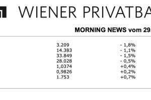 Aus den Morning News der Wiener Privatbank: Die Wiener Börse hat am Donnerstag etwas höher geschlossen, der ATX konnte sich um 0,3% steigern. Es war insgesamt ein sehr ruhiger Handel, der hauptsächlich von den Ergebnisvorlagen einiger Unternehmen dominiert wurde. Schoeller-Bleckmann konnte nach der Präsentation 1,0% zulegen, die Zahlen waren weitgehend im Rahmen der optimistischen Erwartungen, der Ölfeldausrüster konnte sowohl beim Umsatz als auch beim Gewinn zulegen und erzielte nach eigenen Angaben die höchsten Werte für die ersten drei Geschäftsquartale seit zehn Jahren, auch der Auftragsbestand übertraf die Schätzungen. Immofinanz legte ebenfalls ein sehr starkes Ergebnis nach den ersten neun Monaten des Jahres vor, die Mieterlöse beliefen si... » Weiterlesen