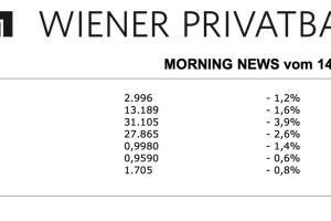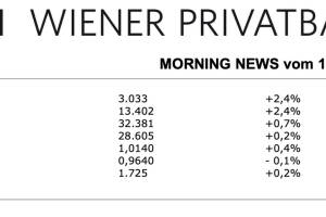 Aus den Morning News der Wiener Privatbank: Die heimische Börse konnte mit klaren Aufschlägen in die neue Woche starten und den Elan der Vorwoche mitnehmen, der ATX endete mit einem Zuwachs von 2,4% und verbuchte damit bereits den vierten Gewinntag in Folge. Schon über Nacht waren positive Impulse durch die starken Börsen in Asien gekommen, mit der positiven Eröffnung in den USA kam noch einmal zusätzlicher Schwung in den Handel. Impulsgebende Konjunkturdaten waren hingegen Mangelware, auch von der Unternehmensseite gab es so gut wie keine signifikanten Meldungen. Weiter sehr gesucht waren die großen Bankenwerte, die somit erheblich zur guten Entwicklung des Index beitrugen, für die Bawag gab es einen Anstieg von 1,3%, die Erste Group konnte sich gleich um 4,4% ver... » Weiterlesen