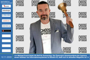 12.11.: Michael Pusch läutet die Opening Bell für Donnerstag, Long Distance Style (vorher nachher unter photaq.com page index 3781 ). Der Österreich-Verantwortliche bei Captrace, einem führenden Anbieter von Informationssystemen im Bereich Investor Relations, stellt sich im aktuellen Börse Social Magazine vor www.captrace.com http: www.boerse-social.com magazine - mehr Choose Optimism: boerse-social.com category choose_optimism www.facebook.com chooseoptimism 11.11.: Michael Seibold läutet die Bell für Mittwoch. Sein Blog „Medicus der Finanzen“ ist beim VBV Smeil Alps 2020 nominiert, Blogs noch bis zum 7.12. unter http: smeil-award.com einreichen www.medicus-der-finanzen.de http: www.vbv.at - Mehr Choose Optimism: boerse-social... » Weiterlesen