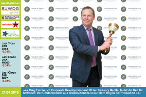27.4: Greg Ferron , VP Corporate Development and IR bei Treasury Metals, läutet die Opening Bell für Mittwoch: Der Goldentwickler aus Ontario Kanada ist auf dem Weg in die Produktion http: www.treasurymetals.com 26.4: Manners Miss Bonbon mit der Opening Bell für Dienstag. Auch Produkte der börsenotierten Manner werden im Goodie-Bag des 1. BSN Finanzmarkttags sein, unter http: www.boerse-social.com roadshow ausgedruckte Einladung einlösen, vor Ort Foto und fertig http: www.manner.com 25.4.: Corrado de Gasperis läutet die Opening Bell für Montag. Der CEO von Comstock Mining ist auf dem Weg, das in Nevada tätige Unternehmen zum 100.000-Unzen-Producer zu machen http: comstockmining.com 22.4. : Elke Koch läutet die Opening Bell für Fre... » Weiterlesen
